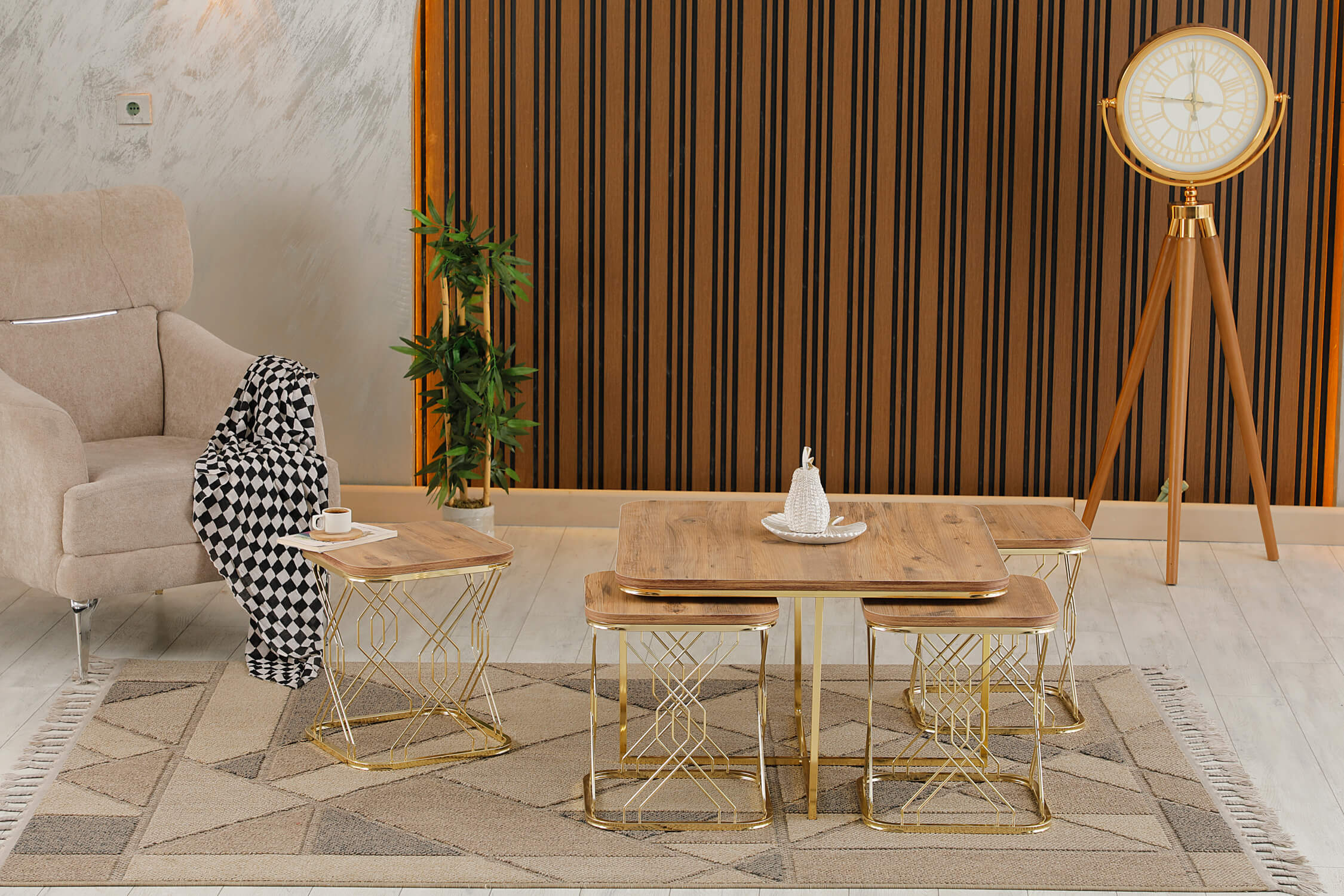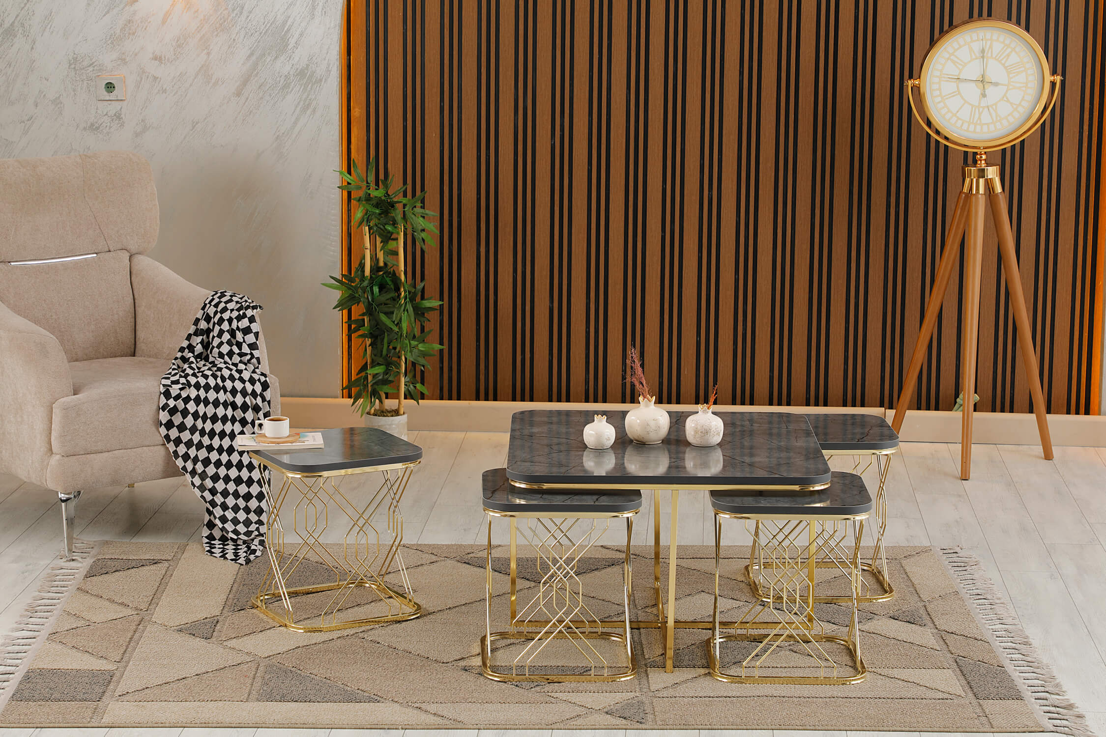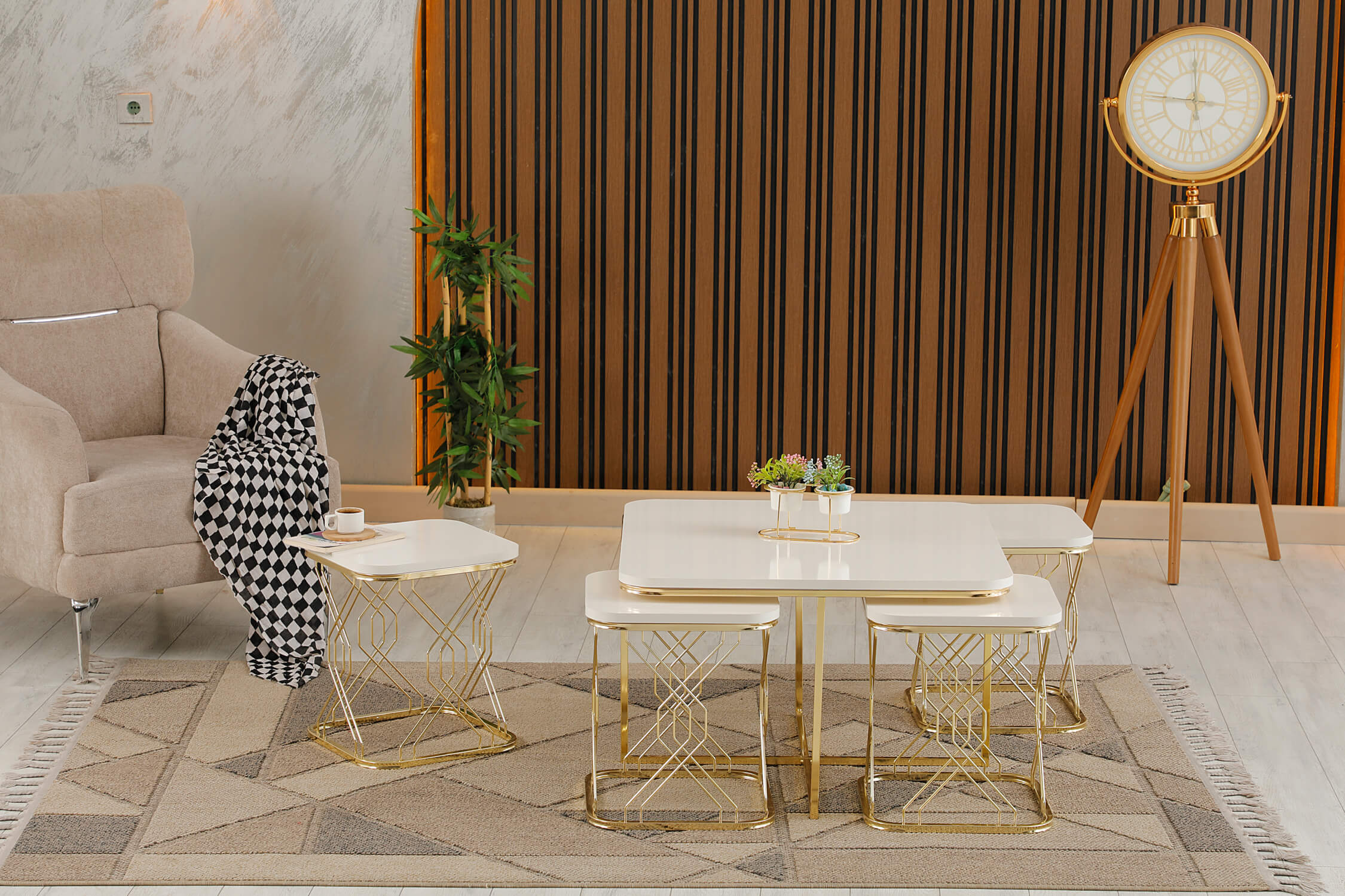 Couchtisch Gold Design – 5-teiliges Satztisch Set mit Metallfuß – Edler Beistelltisch & Sitzhocker