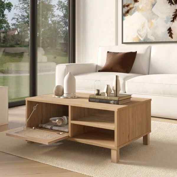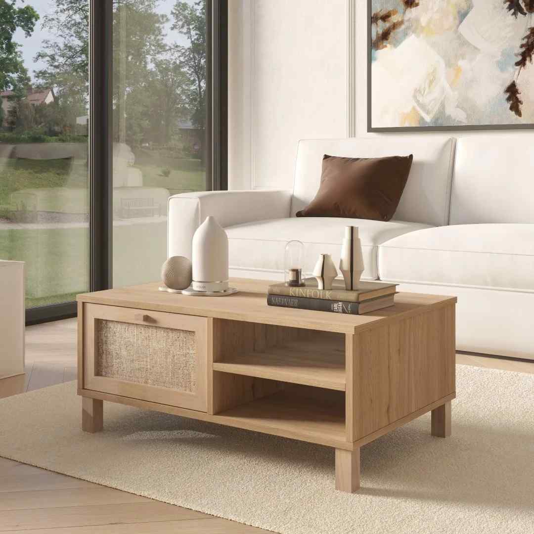 Der Korpus besteht aus 18 mm beschichteter Spanplatte (Suntalam). Für die Front wird massives Buchenholz in Kombination mit Jutegeflecht eingesetzt.
