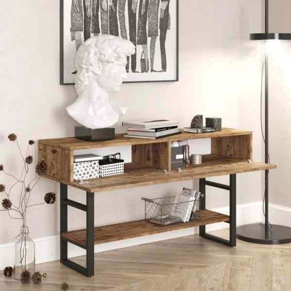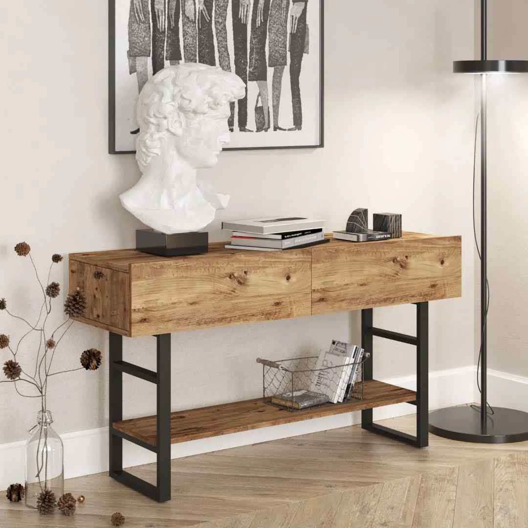 Der Iron Konsolentisch überzeugt durch sein modernes und funktionales Design. Er verleiht Ihrem Wohnraum Wärme und Ästhetik und bietet gleichzeitig eine praktische Ablagefläche für Flur, Wohnzimmer oder Eingangsbereich.