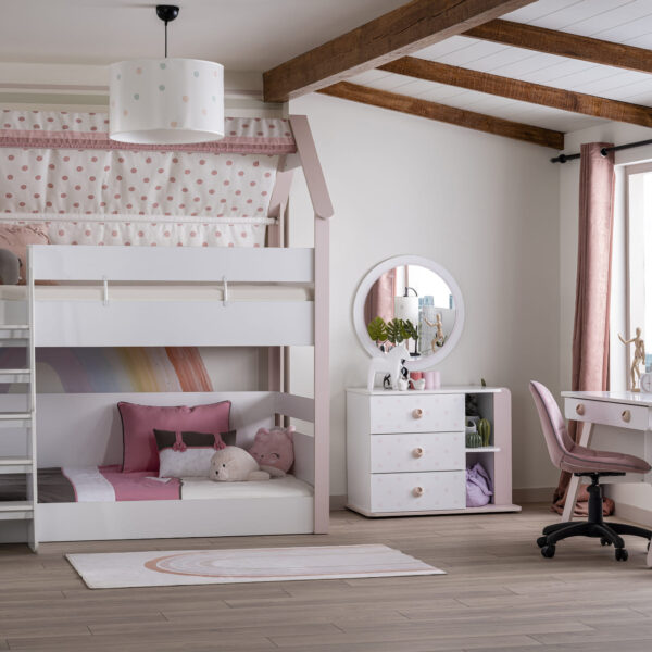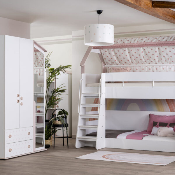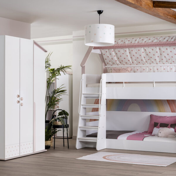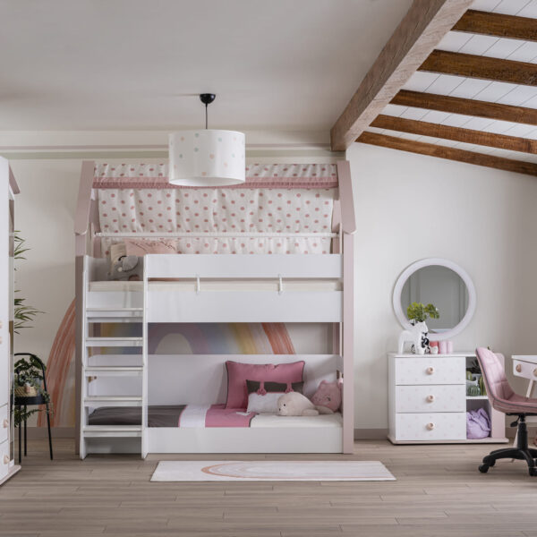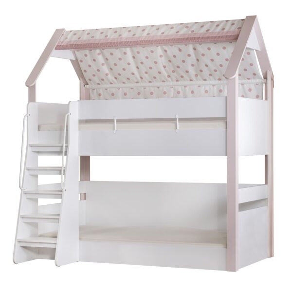 - Ausführung: Etagenbett im Haus-Design mit Stoffdach (rosa Punkte)