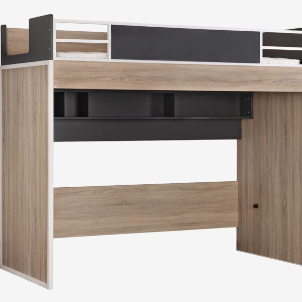 - Design: Holzoptik mit weißen & grafitfarbenen Akzenten; hohe Absturzsicherung; lange Organisations-/Regalleiste unter der Liegefläche; offene Regalfächer am Kopf- und Fußende