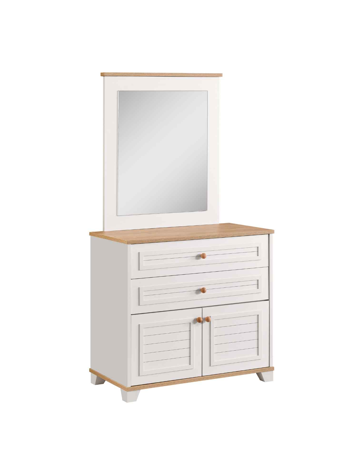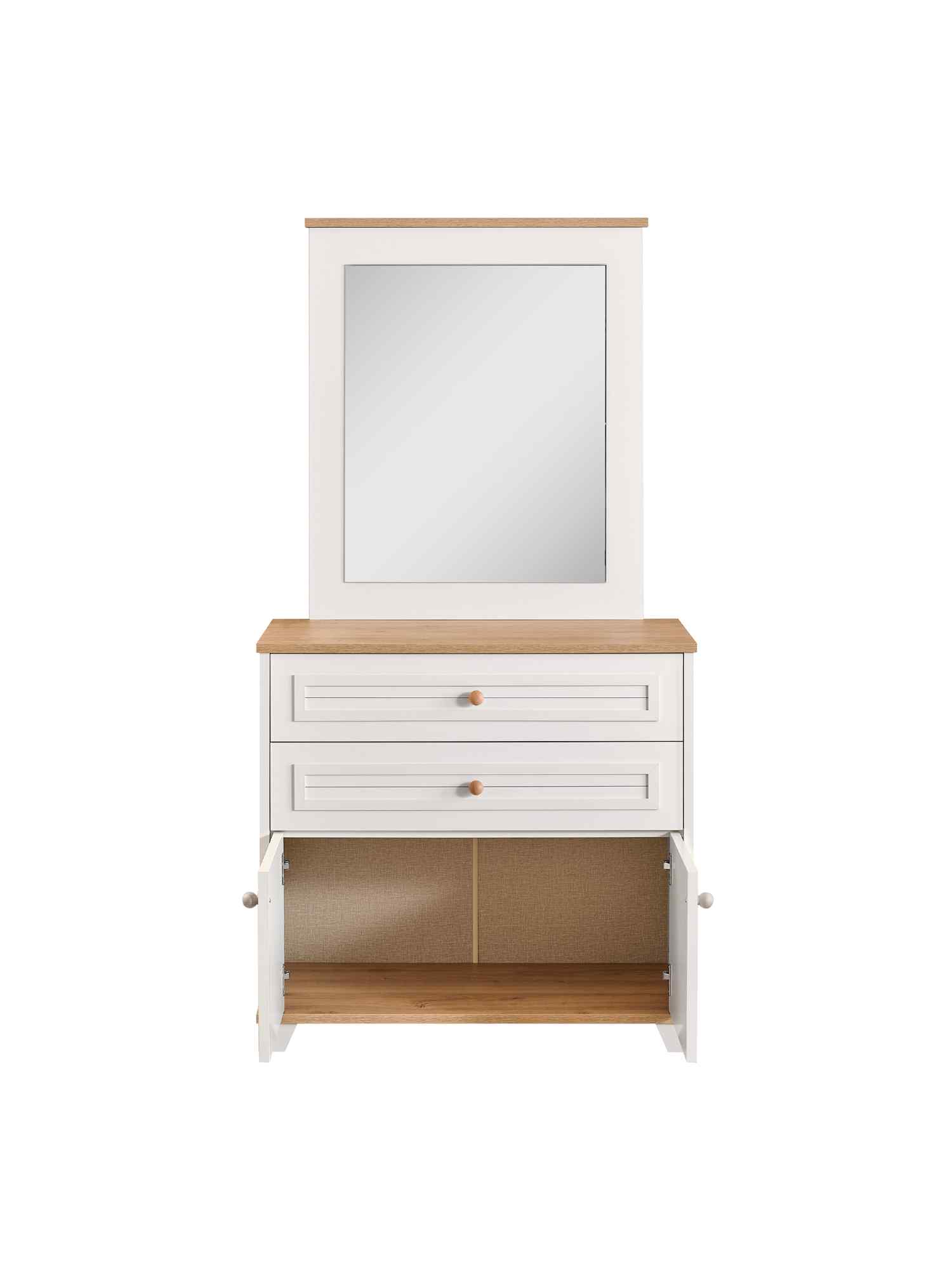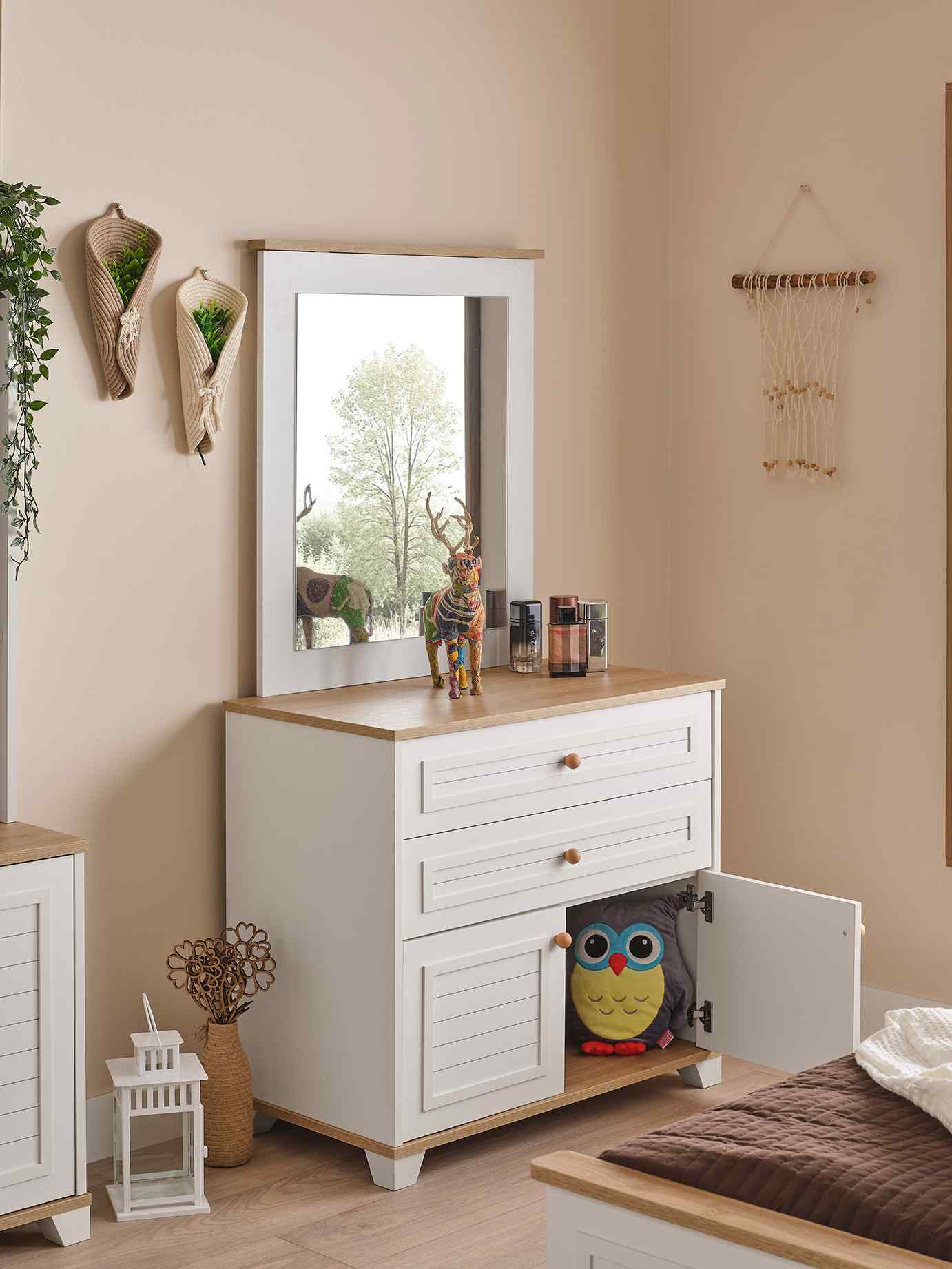 Die harmonische Farbkombination aus Weiß matt und Eiche Dekor sorgt für eine freundliche und moderne Raumwirkung. Die Kommode bietet großzügigen Platz für Kleidung, Spielzeug oder Alltagsgegenstände, während der Wandspiegel den Raum optisch erweitert und mehr Licht reflektiert. Zusammen ergibt sich ein funktionales, stilvolles Möbelensemble, das sich leicht in verschiedene Einrichtungsstile integrieren lässt.