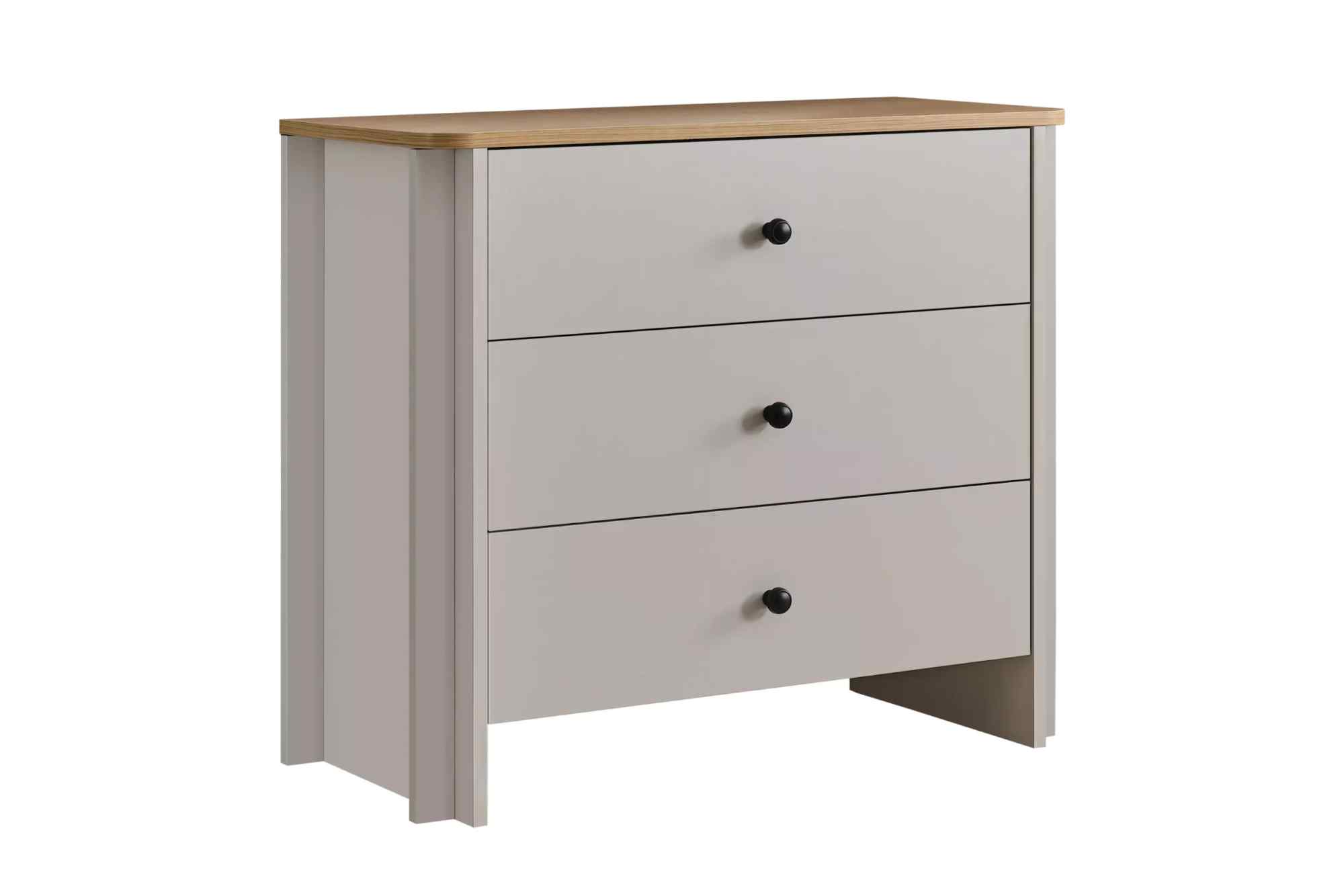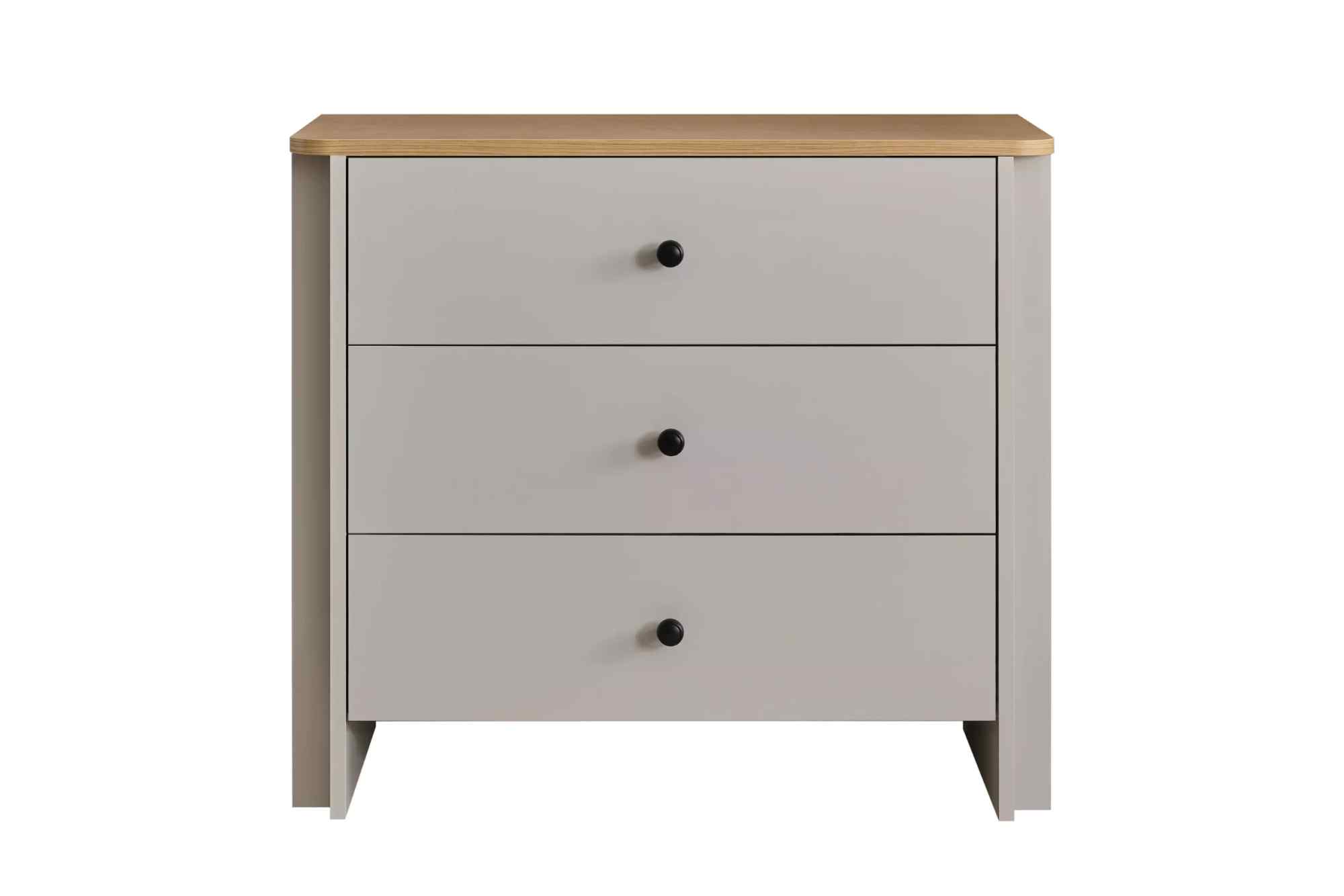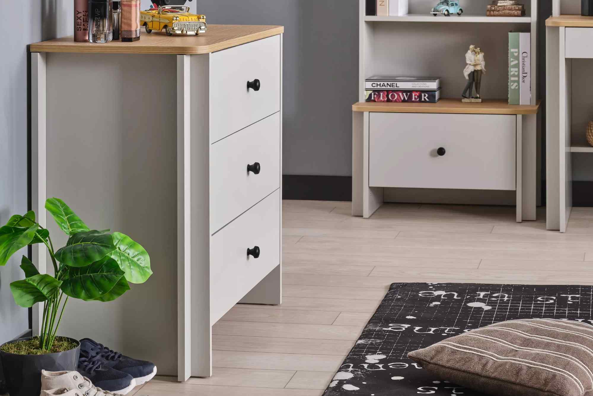 Die KUPA Sirius Kommode bringt Ordnung und modernen Stil in Ihr Zuhause. Mit ihrem zeitlosen Design in mattem Lichtgrau und der eleganten Deckplatte in Eiche-Optik fügt sie sich harmonisch in jedes Jugend-, Schlaf- oder Wohnzimmer ein. Drei geräumige Schubladen bieten viel Platz für Kleidung, Wäsche oder Accessoires, während die robuste Bauweise für Langlebigkeit sorgt.