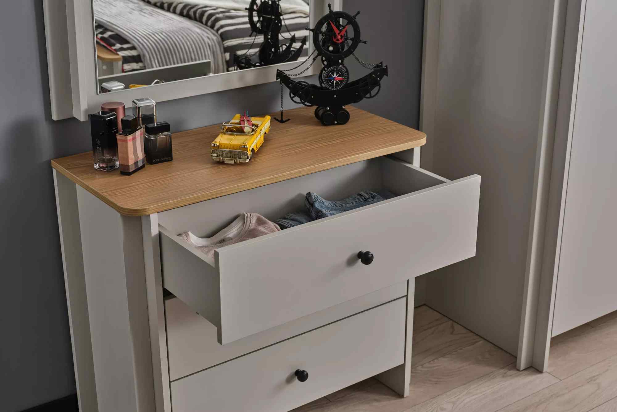 - Großzügiger Stauraum: Die drei breiten Schubladen nutzen die 90 cm Breite der Kommode optimal aus. Hier lassen sich T-Shirts, Socken, Unterwäsche oder persönliche Gegenstände übersichtlich und griffbereit organisieren.