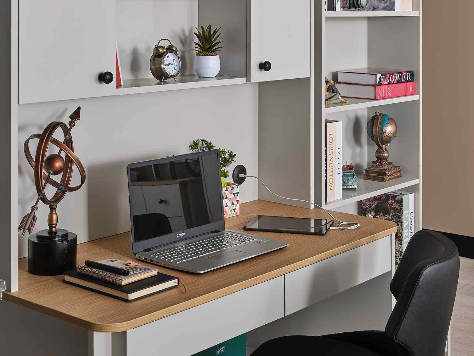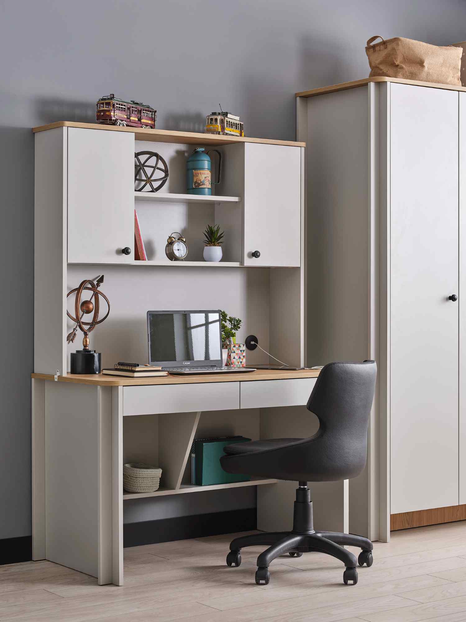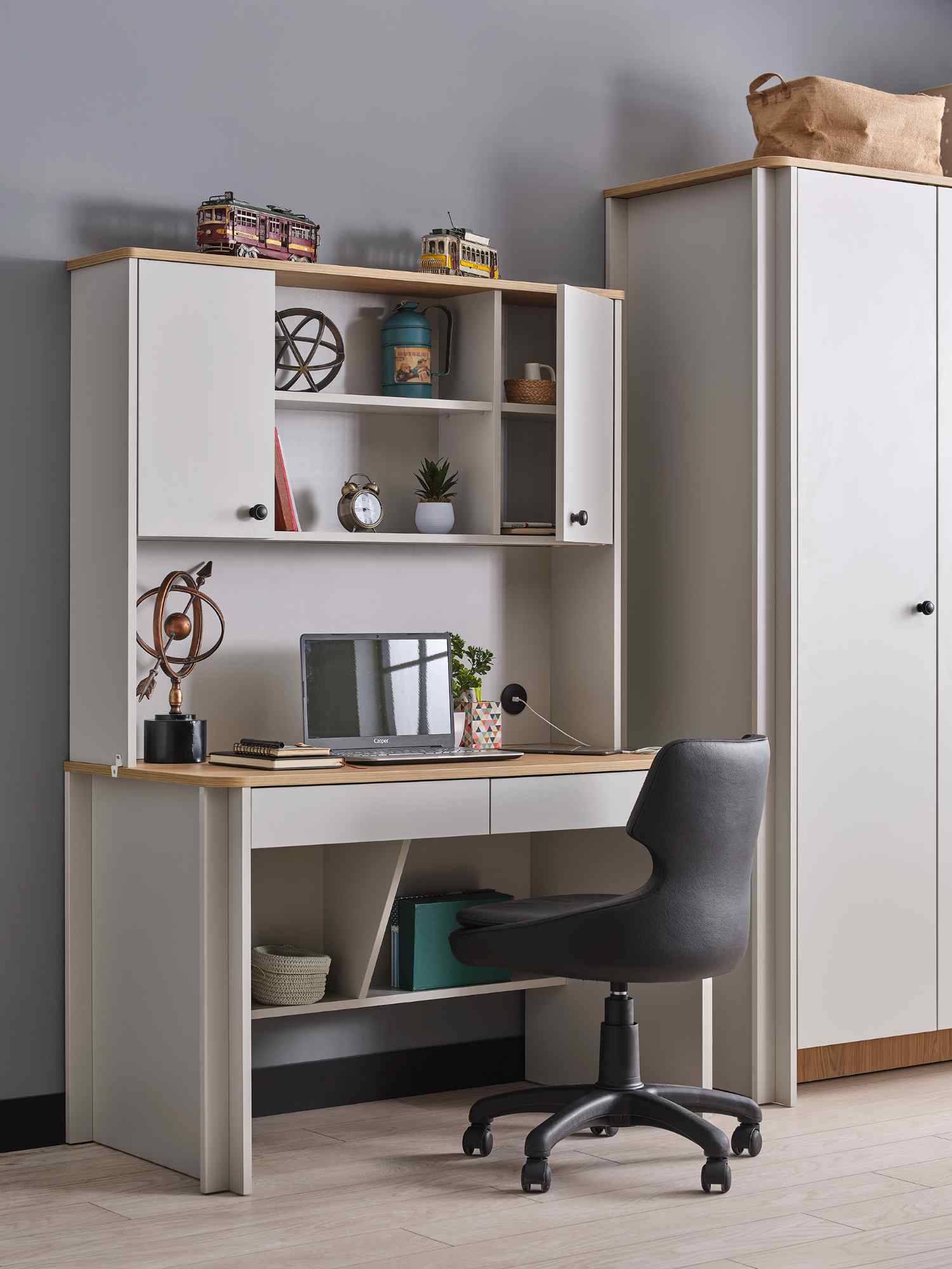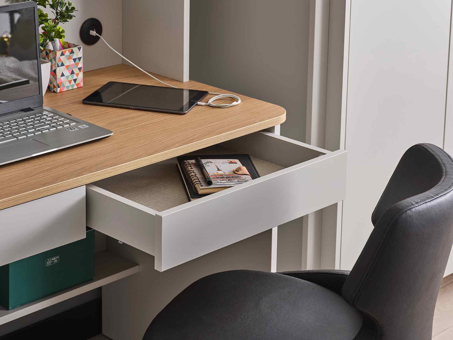 - Cleverer Stauraum: Direkt unter der Arbeitsplatte befinden sich zwei geräumige Schubladen in Grau für Schreibwaren, Hefte und Zubehör. Darunter bietet der Tisch im hinteren Bereich offene Regalfächer, um Bücher oder Ordner griffbereit, aber platzsparend zu verstauen.