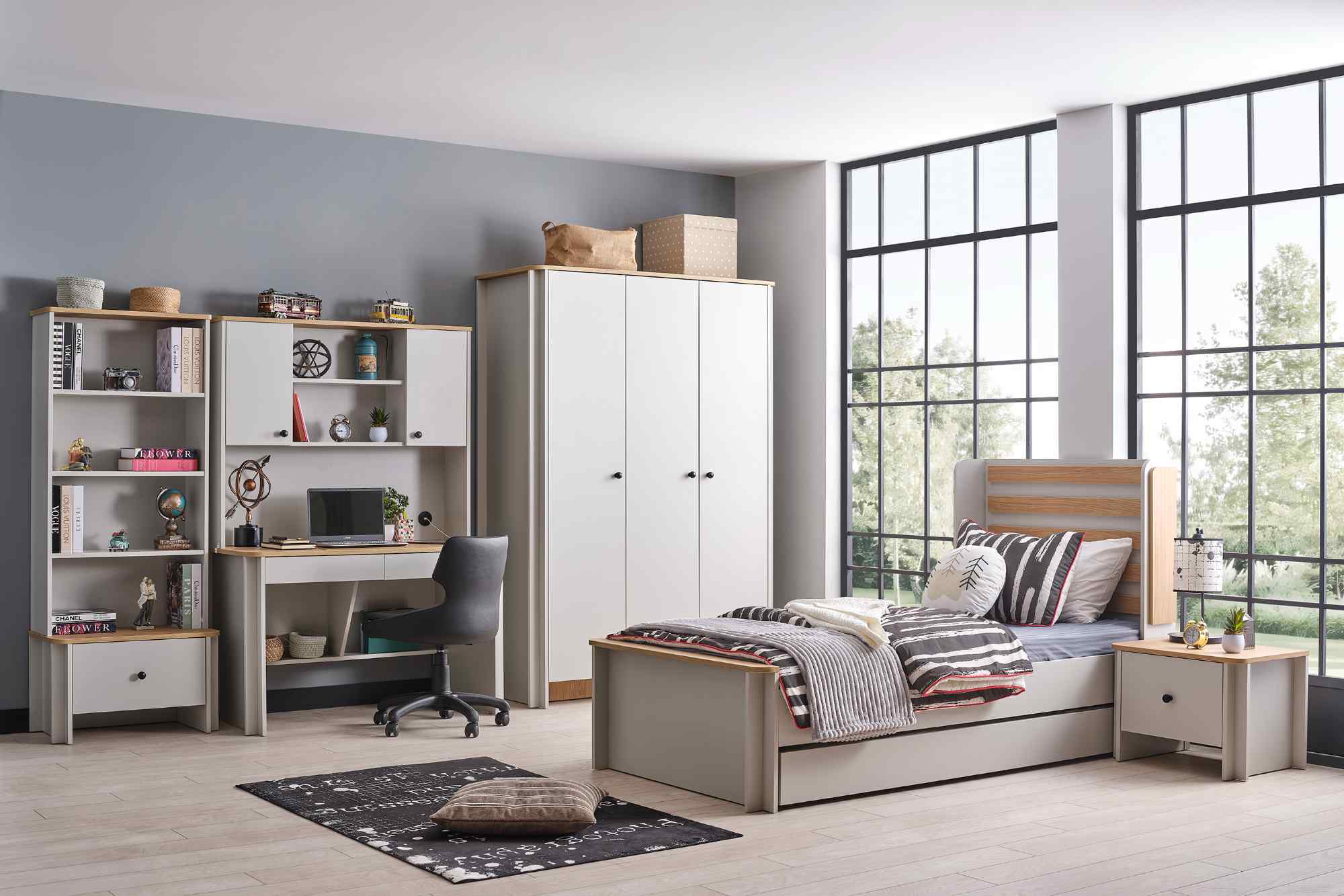 - Zeitloses Design: Die Kombination aus schlichtem Grau und natürlichem Holz-Look wirkt erwachsen und modern. Der Tisch passt perfekt in Jugendzimmer und lässt sich hervorragend mit anderen Möbeln der Sirius-Serie kombinieren.