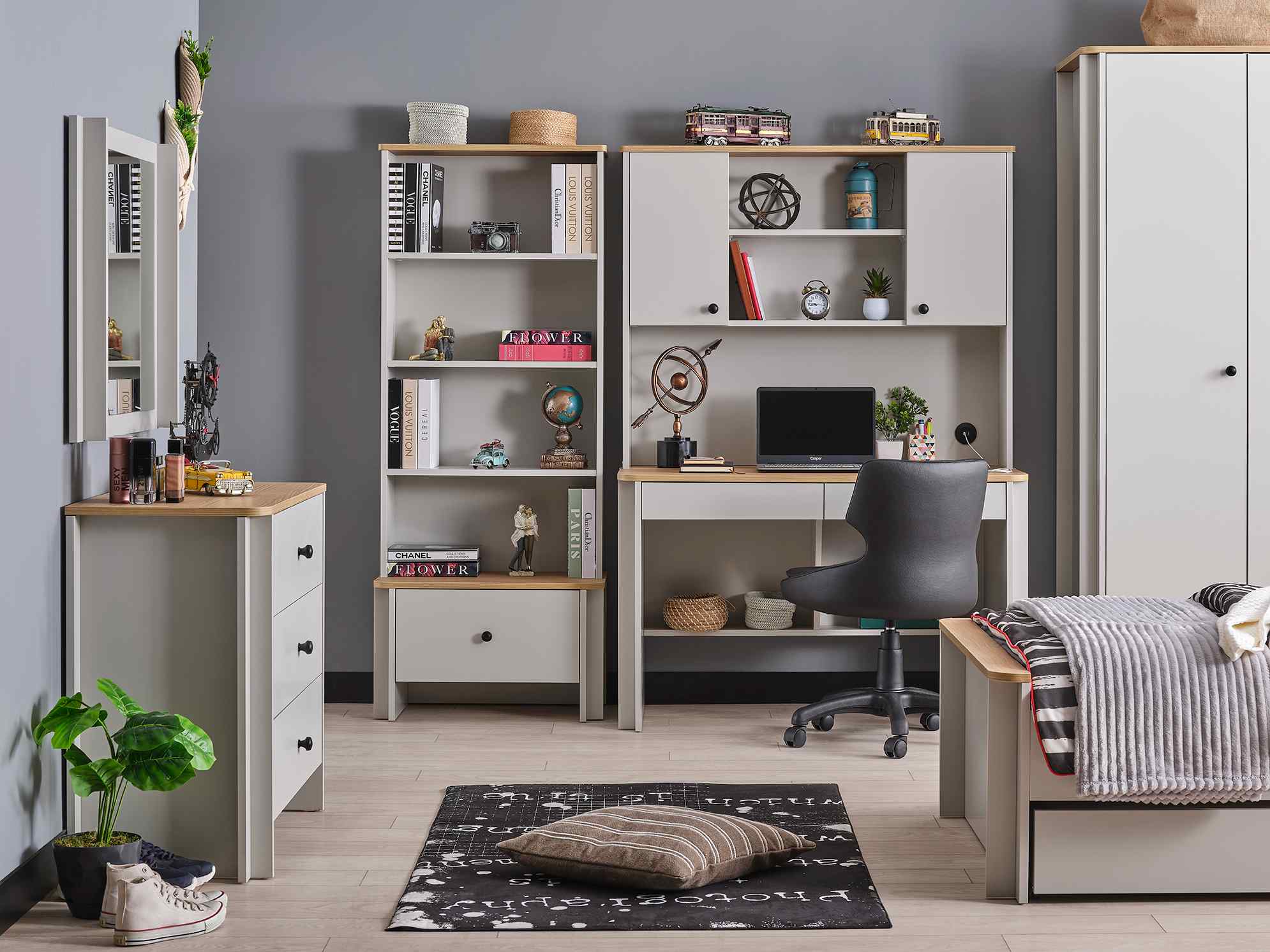 Der KUPA Sirius Schreibtisch ist der ideale Arbeitsplatz für trendbewusste Jugendliche. Er verbindet cooles, mattes Grau mit einer robusten Arbeitsplatte in Eiche-Optik. Das stilvolle Bicolor-Design schafft eine moderne Lernumgebung. Neben der großzügigen Arbeitsfläche überzeugt der Tisch durch cleveren Stauraum: Zwei breite Schubladen und zusätzliche offene Fächer unter der Tischplatte sorgen für perfekte Ordnung.