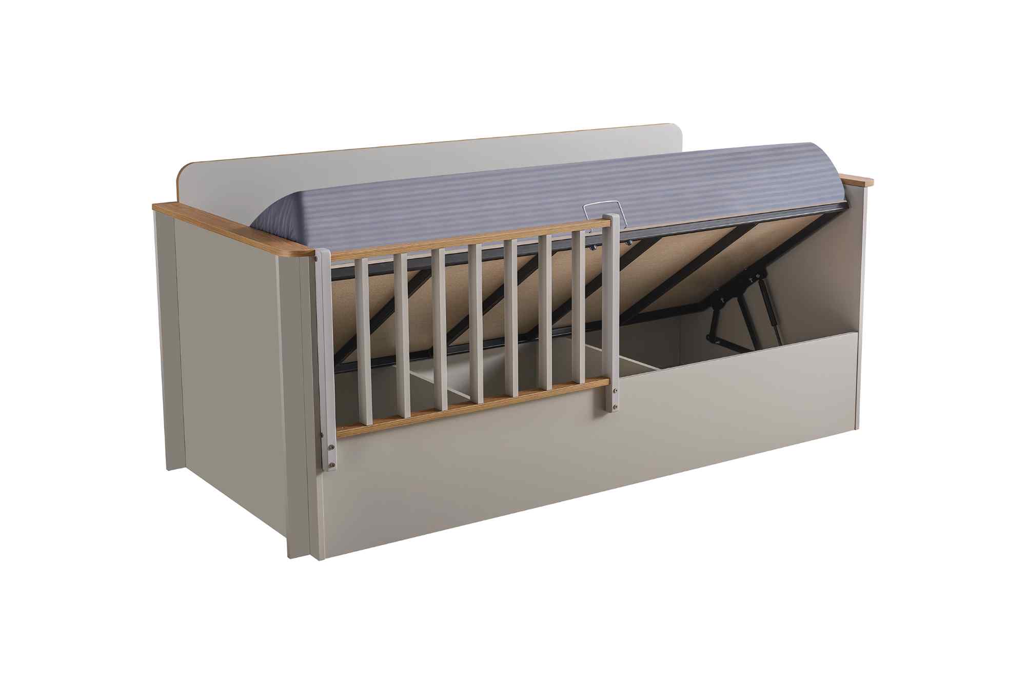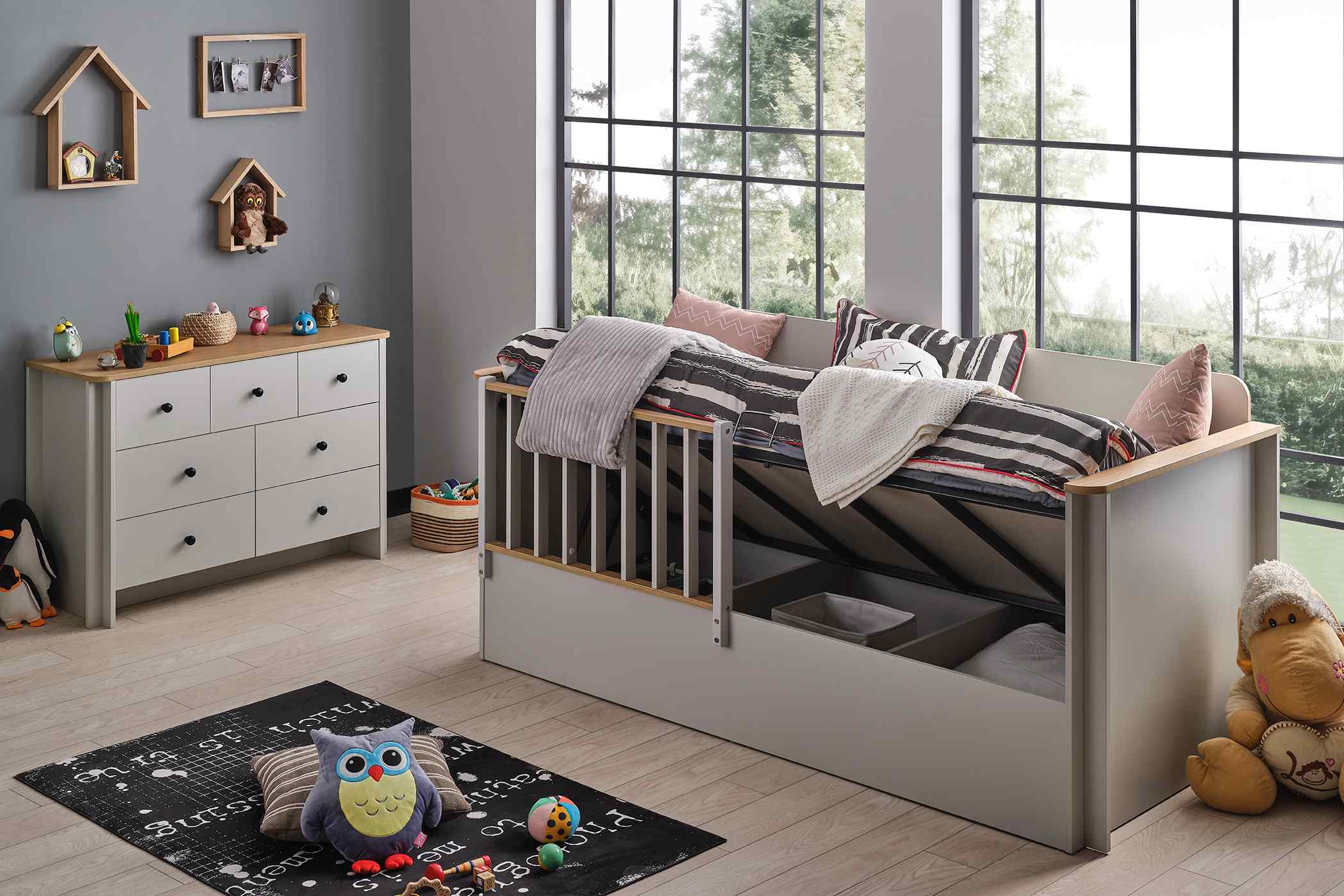 - Ausführung: Toddler-/Juniorbett mit hochklappbarem Bettkasten