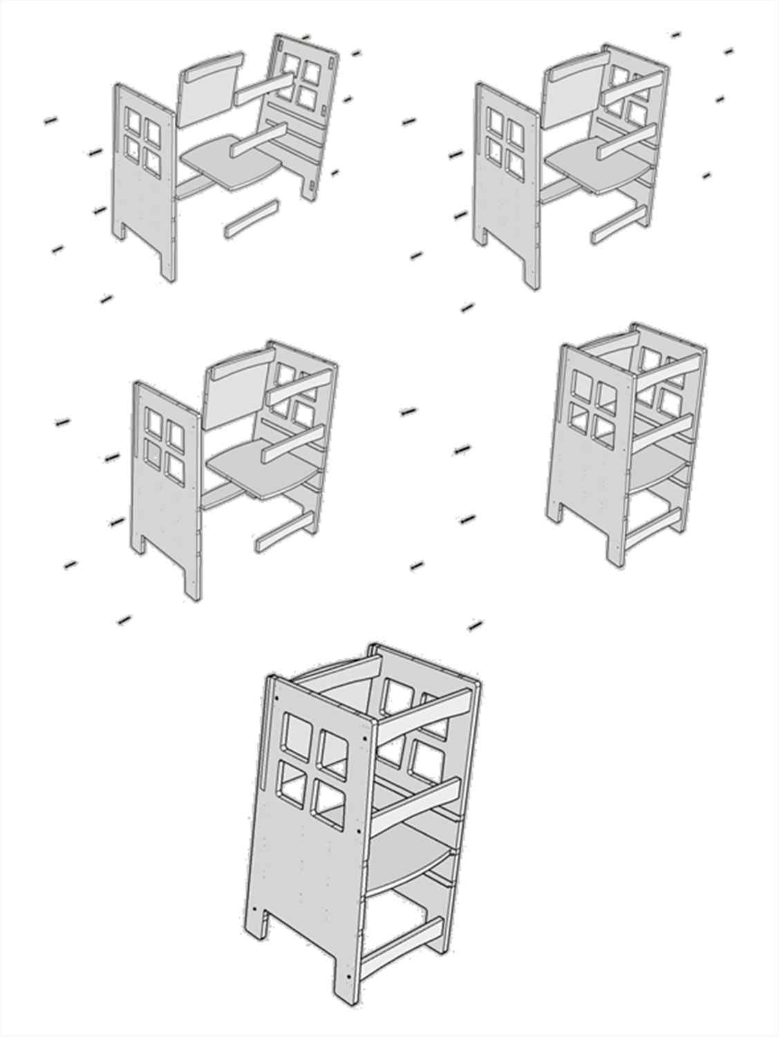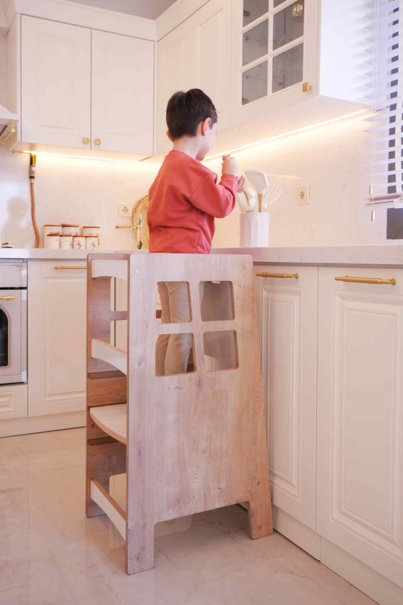 Der Lernturm aus hochwertigem MDF wurde speziell entwickelt, um Kindern auf sichere Weise den Zugang zu erhöhten Bereichen wie Küche, Badezimmer oder Waschbecken zu ermöglichen. So können die Kleinen aktiv am Familienalltag teilnehmen – sei es beim Kochen, Zähneputzen oder spielerischen Lernen.