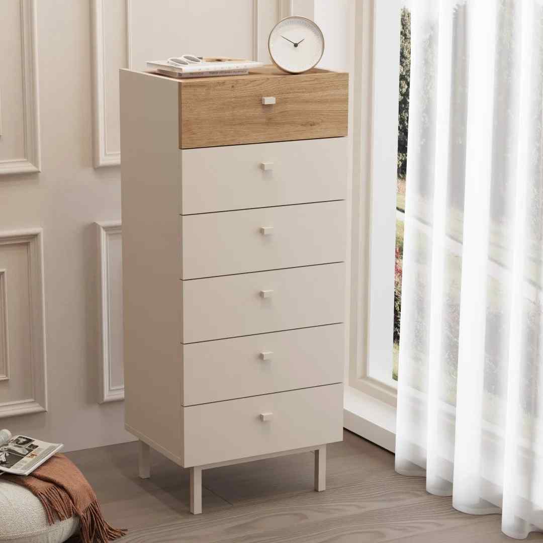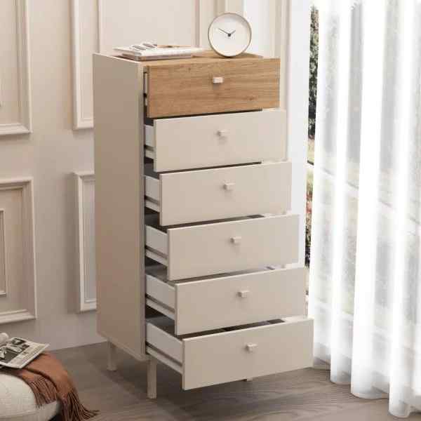 Die Luke Kommode mit 6 Schubladen überzeugt durch ihr modernes Design und ihre funktionale Struktur. Mit ihren eleganten Holzfüßen und der harmonischen Farbkombination Kumsal – Korb verleiht sie Ihrem Wohnraum eine warme und stilvolle Atmosphäre.