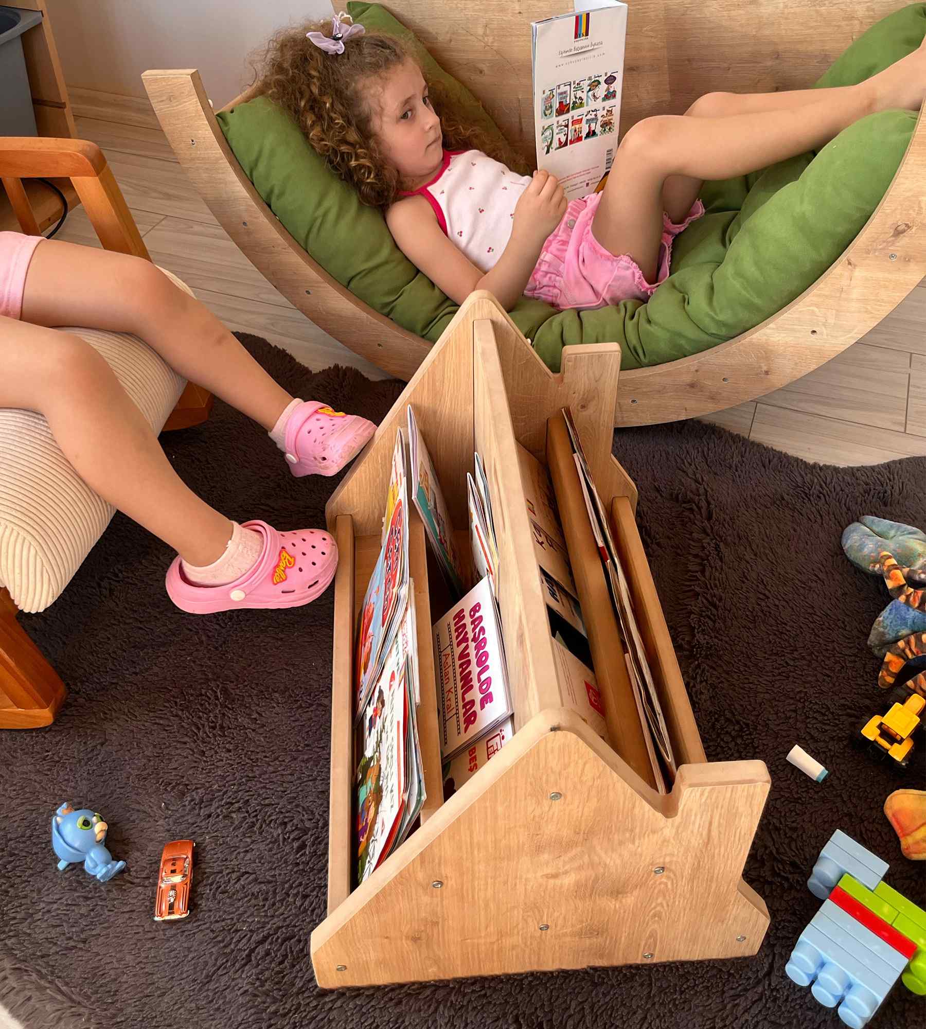 Dank der niedrigen Höhe ist das Regal für Kinder leicht zugänglich – ideal für die selbstständige Auswahl und das Aufräumen von Büchern nach Montessori-Prinzipien.