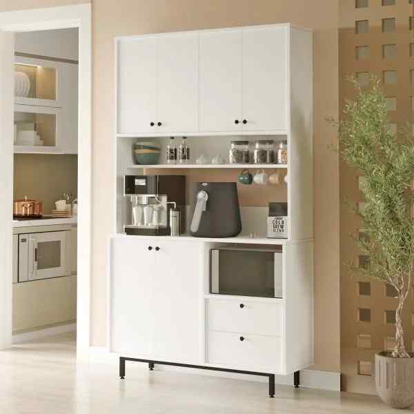 Mit seinen Maßen von 1200 x 355 x 2050 mm (B x T x H) bietet er großzügigen Stauraum für Kaffeemaschine, Tassen, Zubehör und weitere Küchenutensilien.