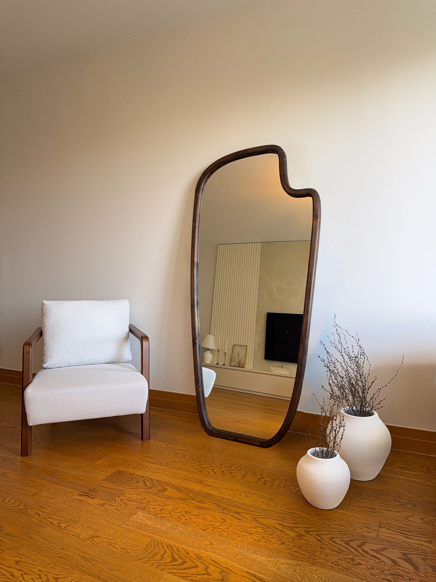 Dieser außergewöhnliche Standspiegel ist mehr als nur ein funktionales Wohnaccessoire – er ist ein kunstvolles Statement-Stück für Ihr Zuhause. Mit seinem einzigartig geschwungenen, asymmetrischen Design bringt er Bewegung und Harmonie in jeden Raum. Die organische Form verleiht Ihrem Interieur eine moderne Natürlichkeit, während der massive Rahmen aus Kiefernholz für Wärme und Stabilität sorgt.