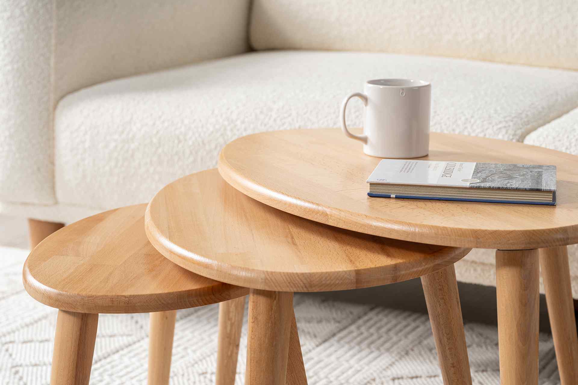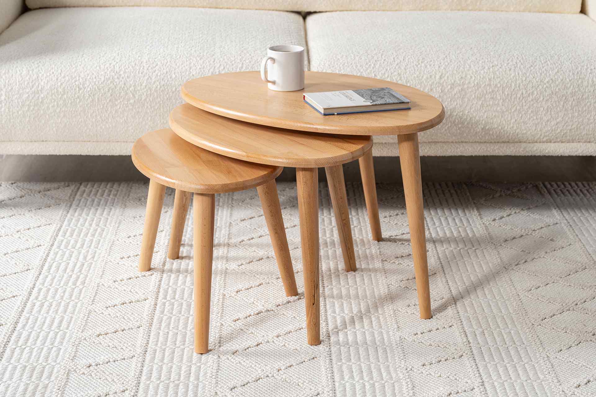 Das Valens Satztisch-Set vereint natürliche Eleganz mit praktischer Nutzbarkeit. Jedes der drei Tische wurde sorgfältig gestaltet, um Ihrem Wohnraum eine warme und stilvolle Note zu verleihen.