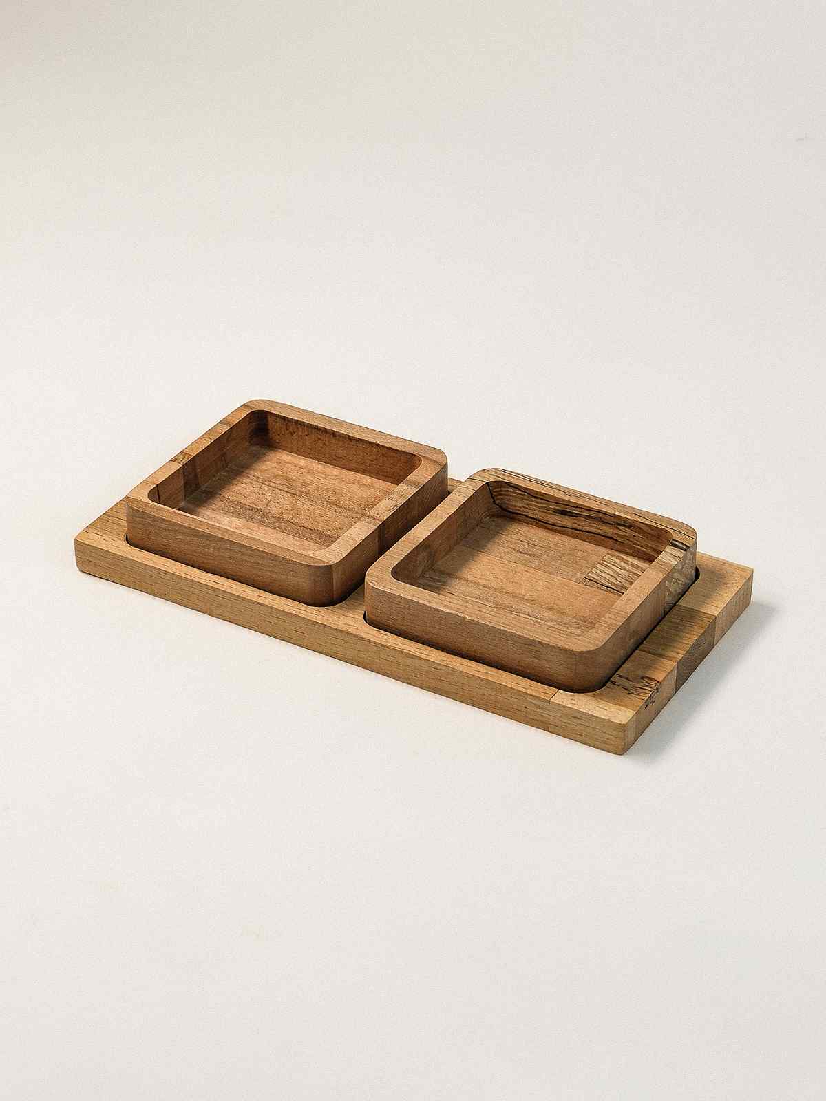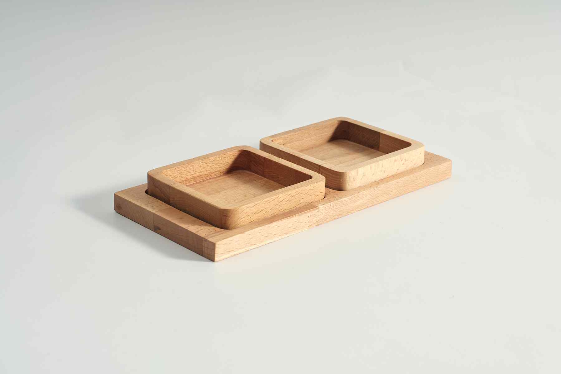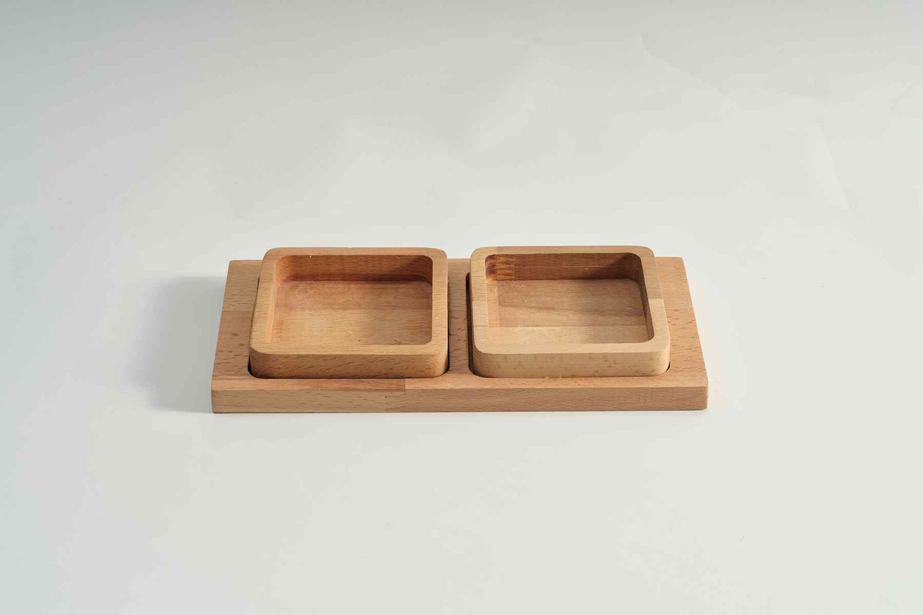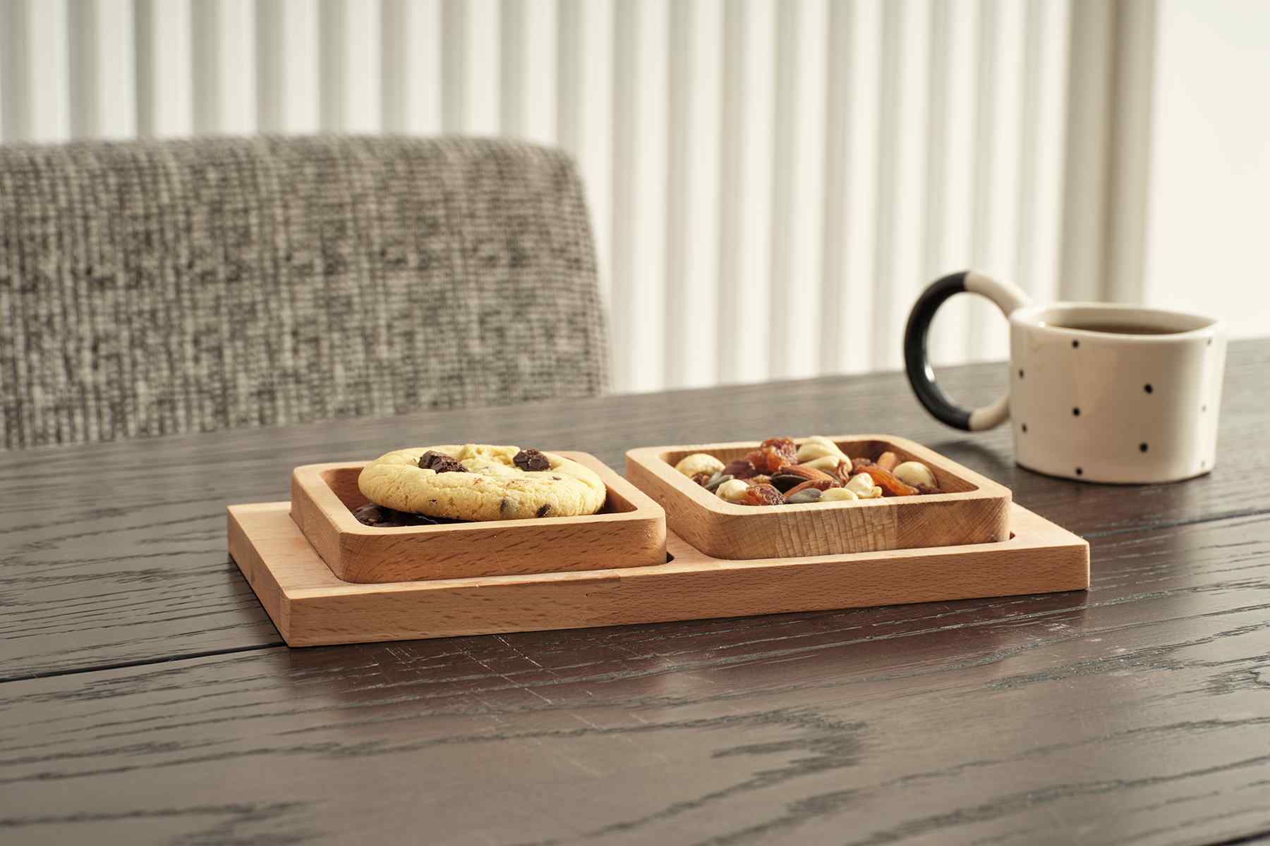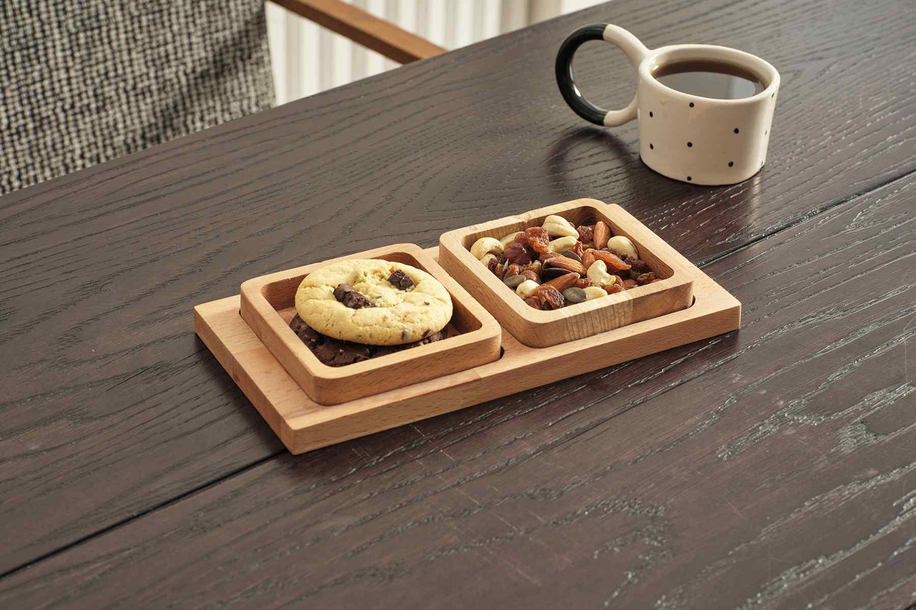 für Küche und Tisch. Die zweigeteilte Servierschale aus massivem Buchenholz eignet sich ideal für Nüsse, Snacks,